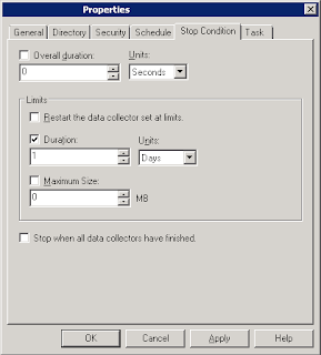Once you launch the collection, unless you want to run it forever, you most likely have a strategy when the collection should stop. You can configure when it stops under the Stop Condition tab. The Overall duration determine how long a collection run. For example if you have 6 hours, then it would stop 6 hours after the schedule first start running. See I put first? Mean if you have overlap schedules, let say one schedule start at 1:00AM, and another schedule start at 2:00AM. If you set the overall duration to 2 hours, it stops at 3AM (2 hour after when it first run). Next is where it gets a little bit complicated. The limits is another way to stop the collection. You have two types of limit: Duration and Maximum Size. Whichever limit is reached first will stop the collection. There is one nice option Restart the data collector set at limit. It creates a separate log file once the limit hit. You want to configure the file name convention correctly, if not you will get an error. e.g. if you configure your file to not overwrite and not append, and it tries to create the same file name. Please notes that the overall duration override the limits. The Stop when all data collectors have finished option description is a little confusing. if you have configured overall duration, this option basically stop the collection once all the data collectors record its most recent values. Mean, as long as all your data collectors (if you have multiple) record a value, it will stop the collection. I still couldn't think of a use case for this purpose. If you do, please leave a comment below. I always leave this option unchecked.