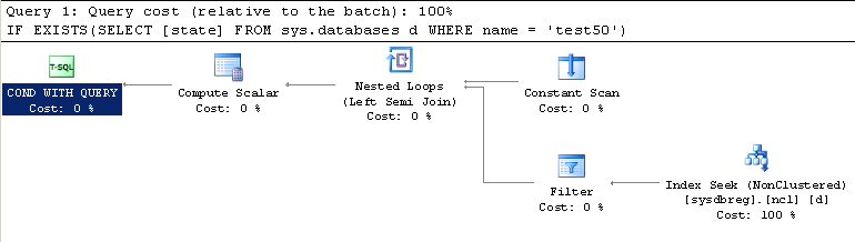 SET STATISTICS IO ON; SET STATISTICS TIME ON; GO DBCC FREEPROCCACHE; DBCC DROPCLEANBUFFERS; GO IF EXISTS(SELECT [state] FROM sys.databases d WHERE name = 'test50') BEGIN SELECT 1; END