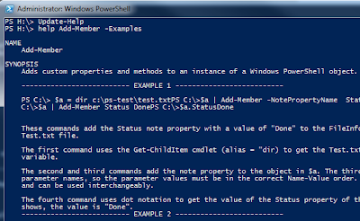 Execute the Get-Help command again and you would see the all the details on Add-Member. If you notice, the above screen shot has a -Examples property for Get-Help cmdlet. This lists out examples of using Add-Member. I found this feature very useful.