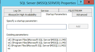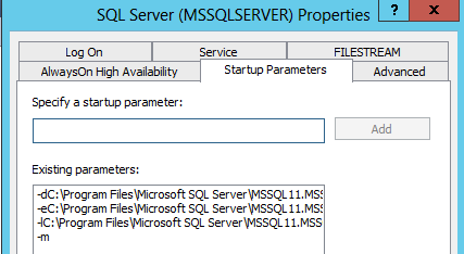 - Select Startup Parameters tab on the top. (For SQL Server older than SQL Server 2012, refer note below)