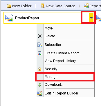 Navigate to the ProductReport, and click the drop down button and select Manage.