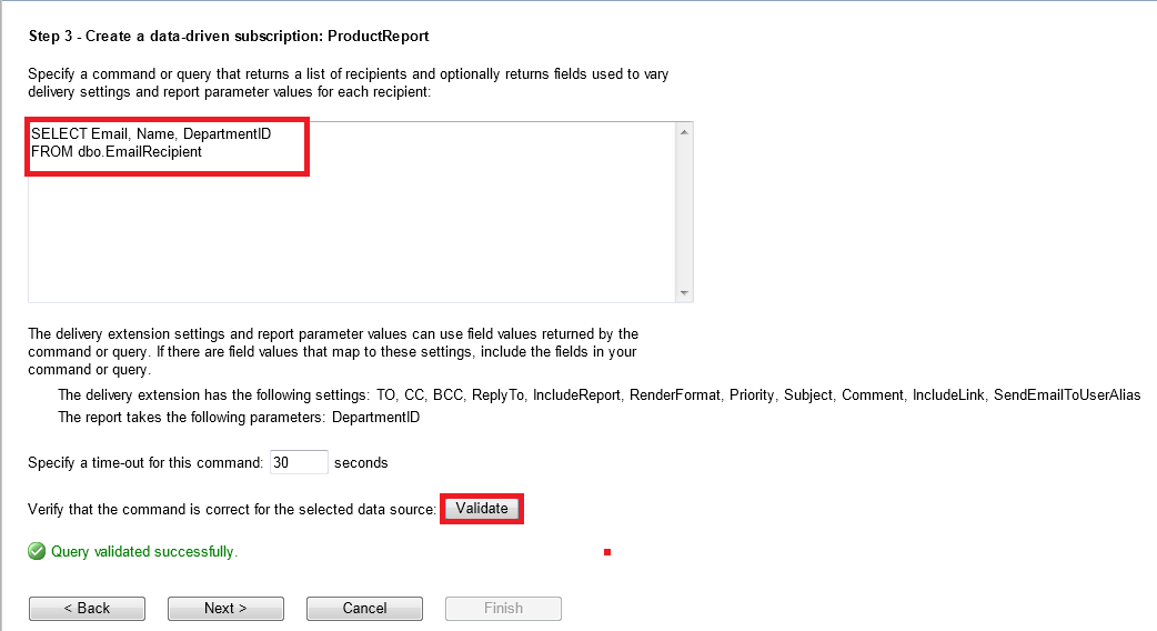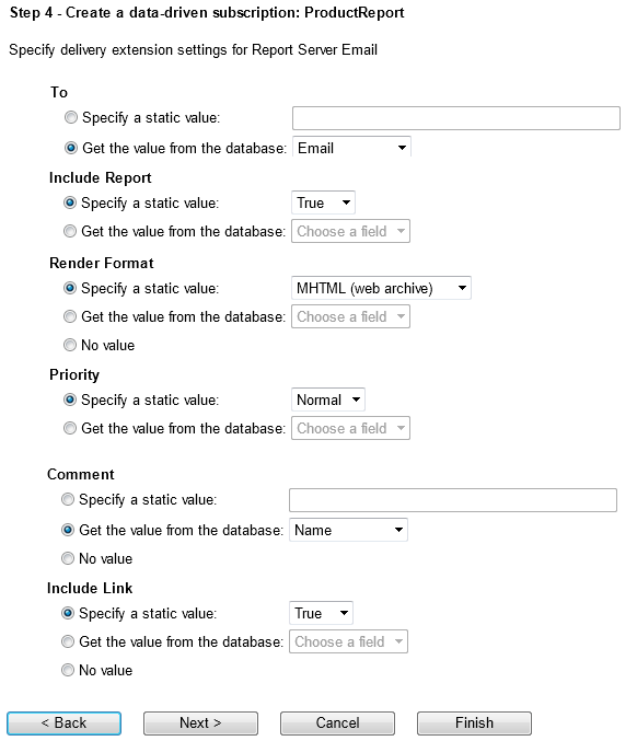 Next, specify and configure the data driven subscription delivery extension setting. Here is where the mapping of a dataset column with certain subscription property such as email recipient, render format, subject and etc. Change To property to Get the value from the database with Email in the drop down list. (Optional) Change the Comment to Get the value from the database with Name in the drop down list. This put the name of the manager in the email body.