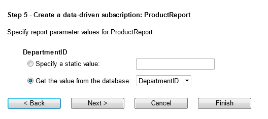 The following step map the report parameter (DepartmentID) with DepartmentID dataset column. This is to filter the product listing report with only the product from the manager's department.