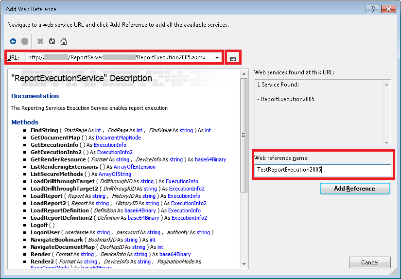 In the Add Web Reference window, type or paste the Report Server Web Service URL with ReportExecution2005.asmx at the end of the string and click the arrow button. Give it Web Reference Name as TestReportExecution2005. Click Add Reference.