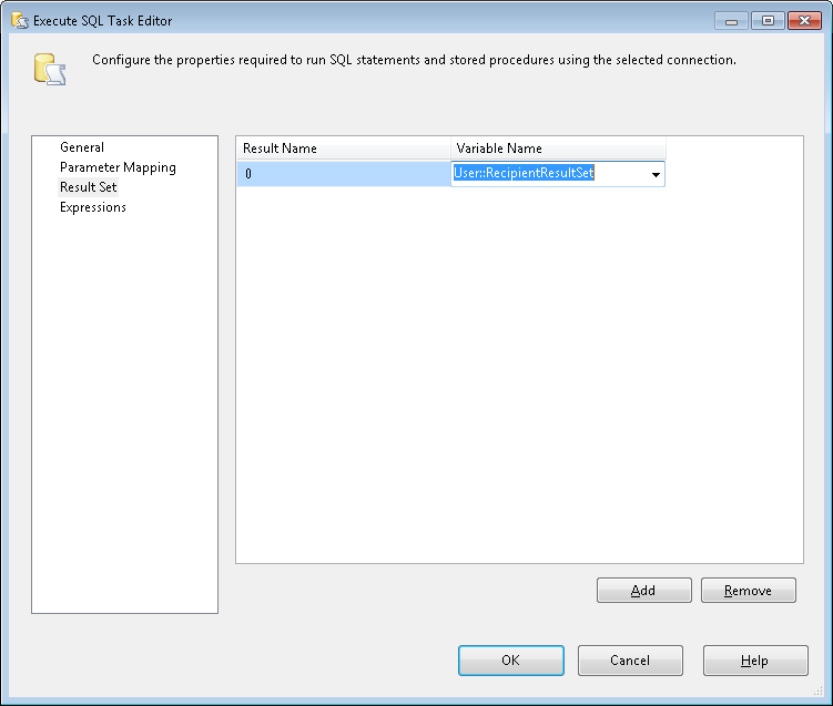 Select the Result Set, enter 0 in the Result Name and select User::RecipientResultSet as Variable Name. This step map the query result to the variable.