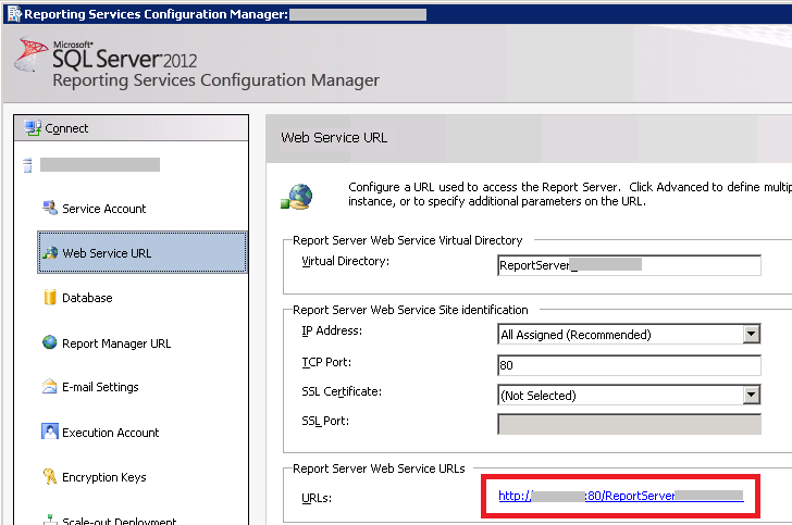 This task utilize the Report Server Web Service to process and render report hosted in SQL Server Reporting Server via ReportExecution2005 endpoint. Open the Reporting Services Configuration Manger, and locate the Report Server Web Service URLs. Copy the address for later use.