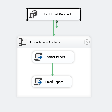 Create a Execute SQL Task by dragging one from the SSIS toolbox onto the control flow, and change the name to Extract Email Recipient. Create a Foreach Loop Coailntainer below it and create two Script tasks in the container, and rename the tasks to Extract Report and Em Report respectively. Connect the tasks. Here is how it should look like,