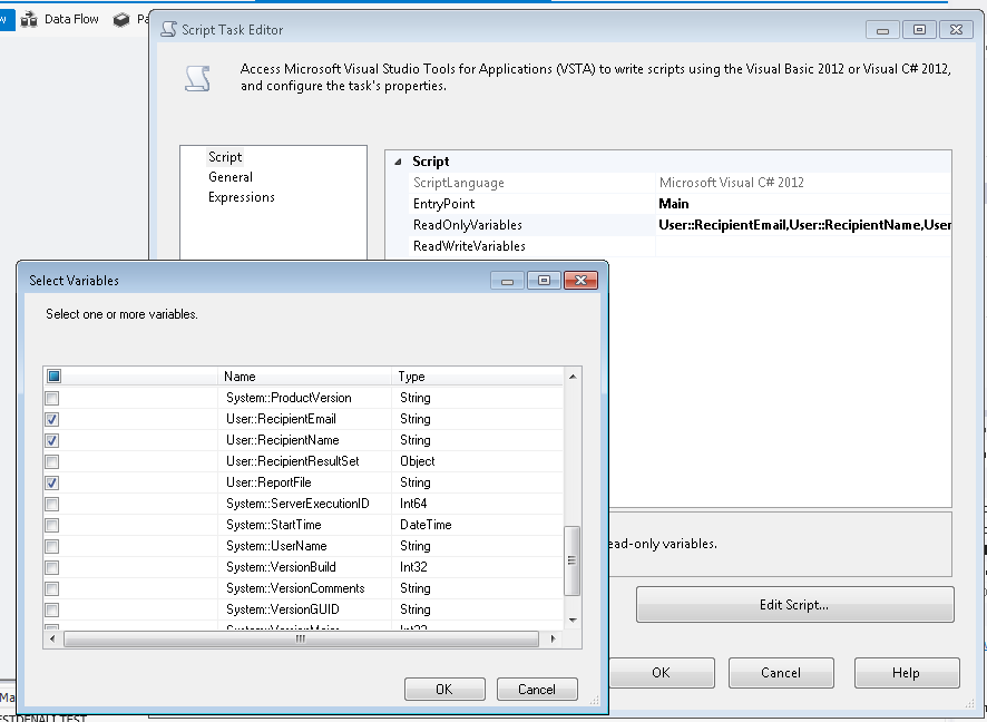 Save the script and click OK on the task.The next step is to configure the Email Report script task. Double click the task to open the editor. Assign User::RecipientEmail, User::RecipientName, User::ReportFile to the ReadOnlyVariables. Click Edit Script to add the script below.