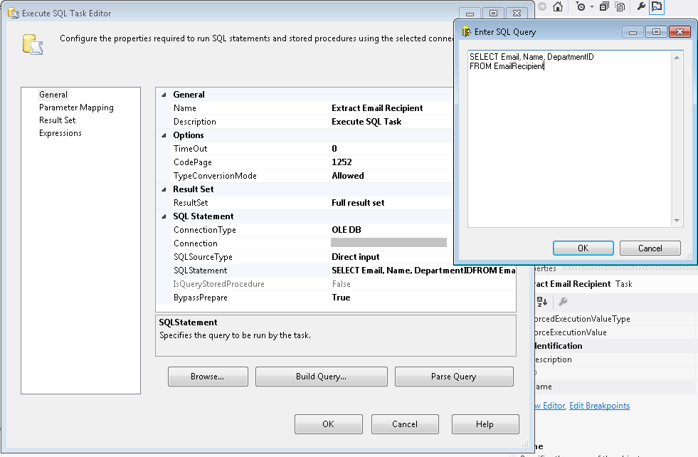 Configure the Extract Email Recipient (Execute SQL Task). Configure the data source connection and the SQL statement