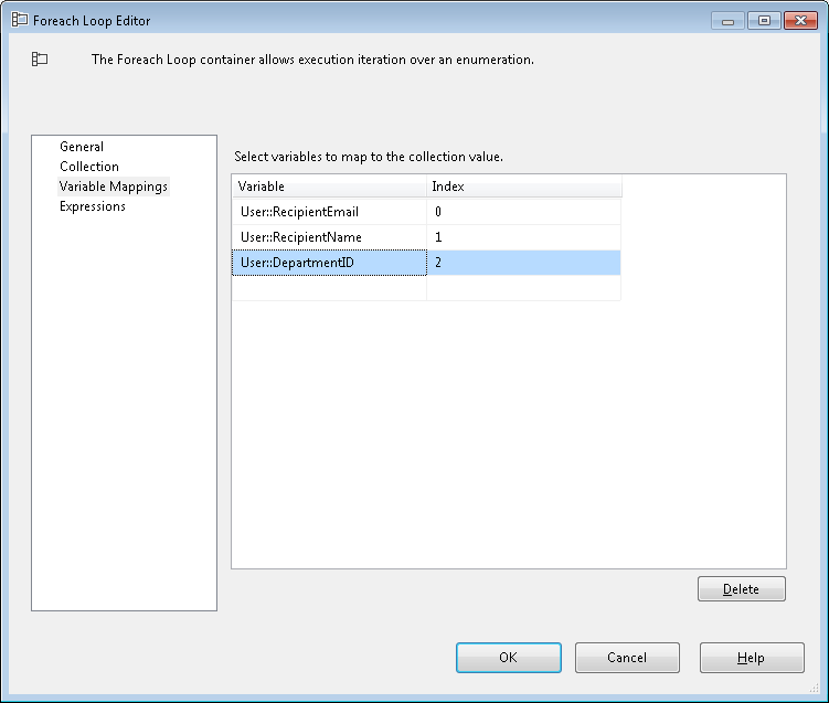 Select the Variable Mappings on the left pane. Add thee variables, User::RecipientEmail, User::RecipientName, User::DepartmentID and map them to index 0, 1, 2 respectively.