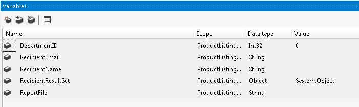 In the variables windows, create 5 variables; DepartmentID, RecipientEmail, RecipientName, RecipientResultSet and ReportFile like shown below. (Make sure the data type is Object for RecipientResultSet)
