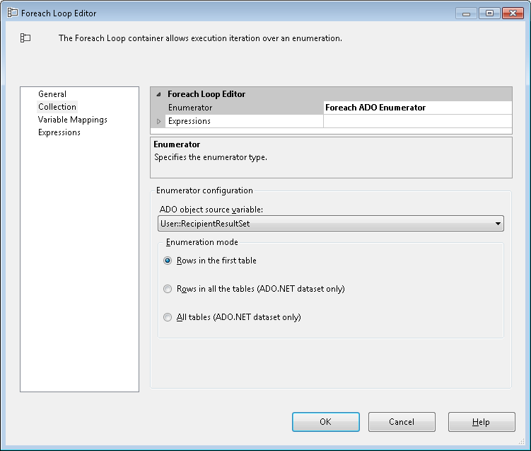 The next step is to configure the for each loop. Double click the for each loop container to open the editor. Select Collection on the left pane. Change the Enumerator to Foreach ADO Enumerator. Select the User::RecipientResultSet in the ADO object source variable drop down list.