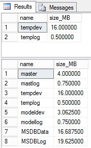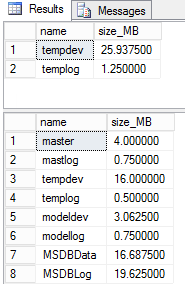 ALTER DATABASE tempdb MODIFY FILE ( NAME = tempdev, SIZE = 16MB ); USE tempdb; SELECT d.name, d.size / 128.0 AS size_MB FROM sys.database_files d; USE [master]; SELECT m.name, m.size / 128.0 AS size_MB FROM sys.master_files m;