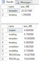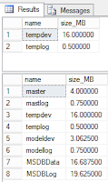 USE model; SELECT d.name, d.size / 128.0 AS size_MB FROM sys.database_files d USE tempdb; SELECT d.name, d.size / 128.0 AS size_MB FROM sys.database_files d USE [master]; SELECT m.name, m.size / 128.0 AS size_MB FROM sys.master_files m