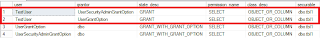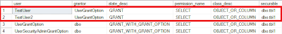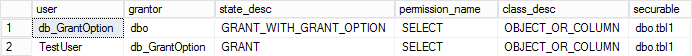 Notice that TestUser is granted with SELECT permission with different grantor? One with dbo as grantor and another with UserGrantOption. When permission is granted by member of db_securityadmin database role, it is granted with dbo. The permission granted by UserGrantOption has the user as the permission grantor.