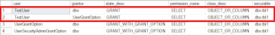 Notice that SELECT permission for both TestUser and TestUser2 have been revoked from the dbo.tbl1 table. However, UserGrantOption itself still have the SELECT permission but not GRANT SELECT permission.