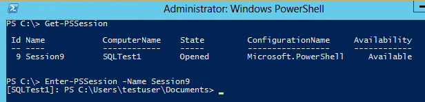 Enter-PSSession -ComputerName SQLTest1 -Credential TestUserEnter password when when prompted. If the remote session is successfully connected, you will see the prompt preceded with remote server name.