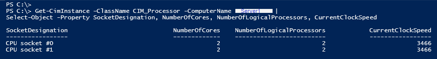 Get-CimInstance -ClassName CIM_Processor -ComputerName Server1 | Select-Object SocketDesignation, NumberOfCores, NumberOfLogicalProcessors, CurrentClockSpeedCIM_Processor represents instance for each processor. This CIM_Processor class is parent class for Win32_Processor