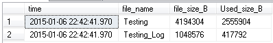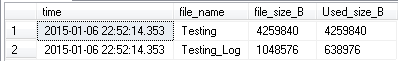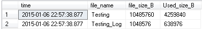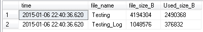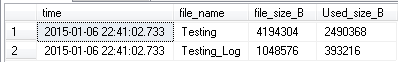 USE testing; SELECT CURRENT_TIMESTAMP AS [time], f.name [file_name], f.size * 8192 [file_size_B], FILEPROPERTY(f.name, 'SpaceUsed') * 8192 [Used_size_B] FROM sys.database_files f;