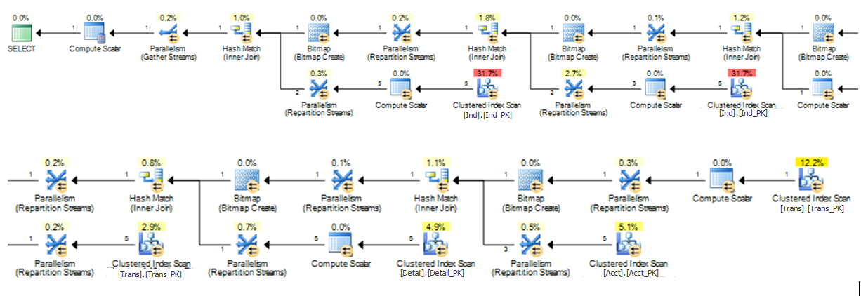 Since this two search conditions are applied as a CASE statement, SQL Server would need to evaluate this two conditions and choose a plan that is good enough for both conditions. In this case, the plan shown previously was chosen. Mostly scan operators along with merge and hash joins.