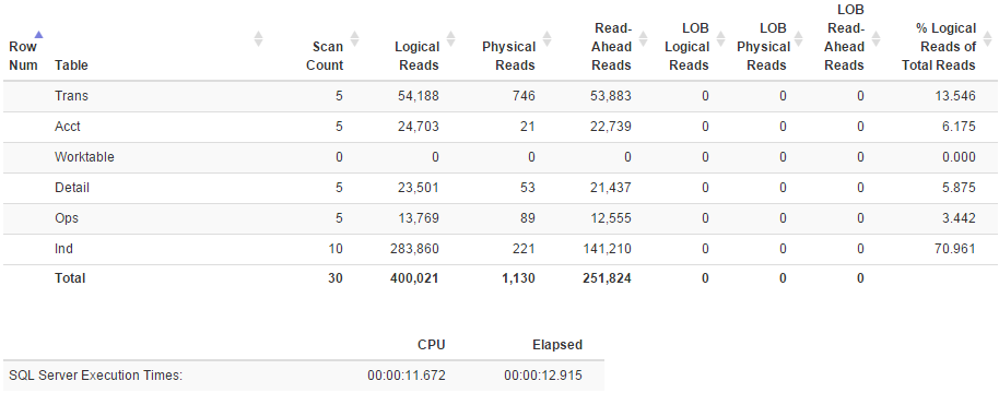 Table 'Ops'. Scan count 1, logical reads 12541, physical reads 27, read-ahead reads 12555, lob logical reads 0, lob physical reads 0, lob read-ahead reads 0.