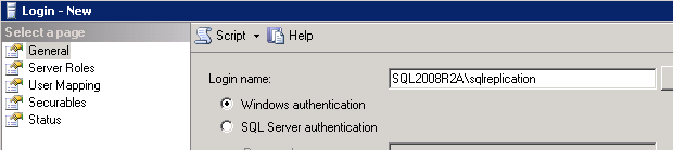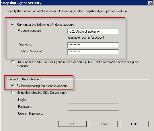 - Connect to Publisher either with a Windows account or SQL account. Windows account will be used in this case. The same Windows account (connecting account) with at least db_owner database role in publication database