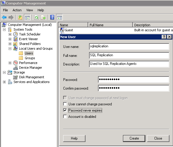 Creates a Windows account with the same name and same password like Server A for replication agents through computer management