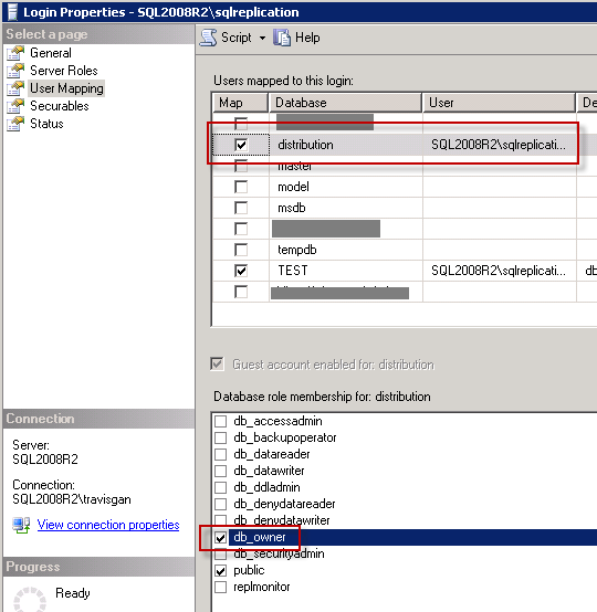 There is one more thing to do here. The sqlreplication Windows account needs to be granted the db_owner role in the newly created distribution database.