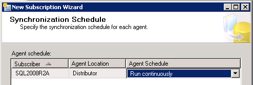 Select initialize when to immediately. This will start the Snapshot agent when the subscription is setup. The snapshot agent will generate the snapshot and synchronization will follow after.