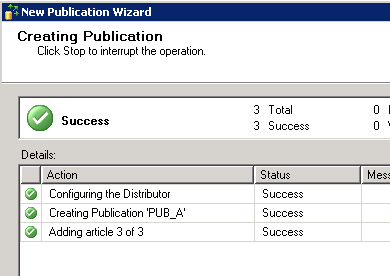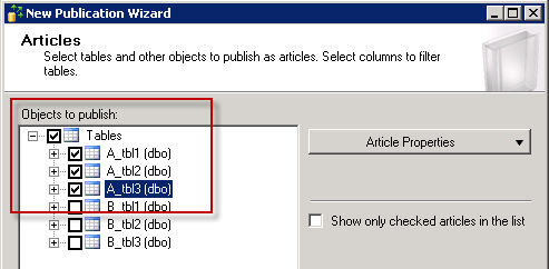 Now we are ready to setup the replication. Let's setup the publication A (PUB_A) on SQL Server A for the three articles (three tables A_tbl1, A_tbl2, A_tbl3). Keep in mind that we will be setting up with push subscription to SQL Server B.