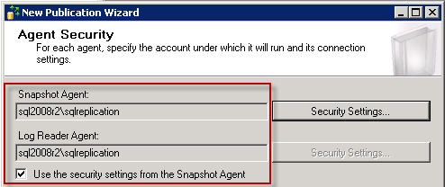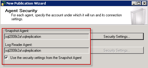 Using sqlreplication account on Server A for snapshot agent. We have previously configured the account with db_owner role in the TEST database.