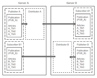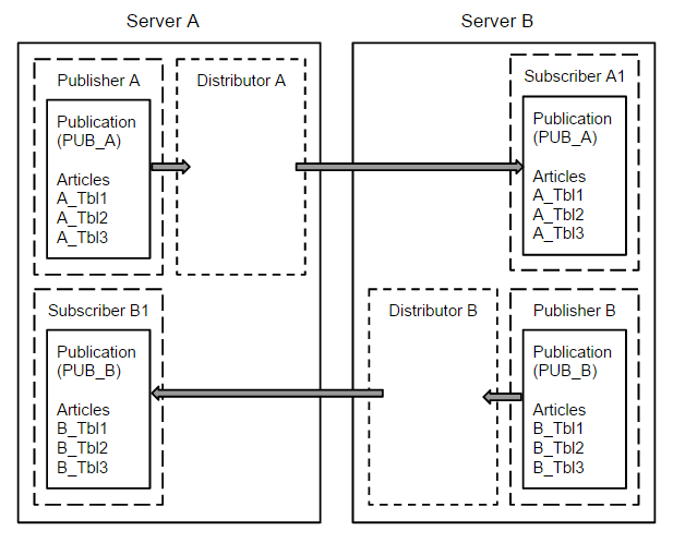 There are two SQL Servers. One hosted on Server A and one hosted on Server B. These two servers are stand alone server on a similar network but not joined to the same domain. Each SQL Server has a database with similar list of tables. Within this list of tables, a set of tables (A_Tbl*) have read/write transactions performed on the database hosted on SQL Server A, with its data also available on SQL Server B for read only purpose. Similarly, there are another set of tables (B_Tbl*) in the database that have read/write transactions performed on SQL Server B, with the data also available on SQL Server A for read only purpose. Any data change occurred on any table of that database on one SQL Server should be promptly reflected on the other SQL Server.