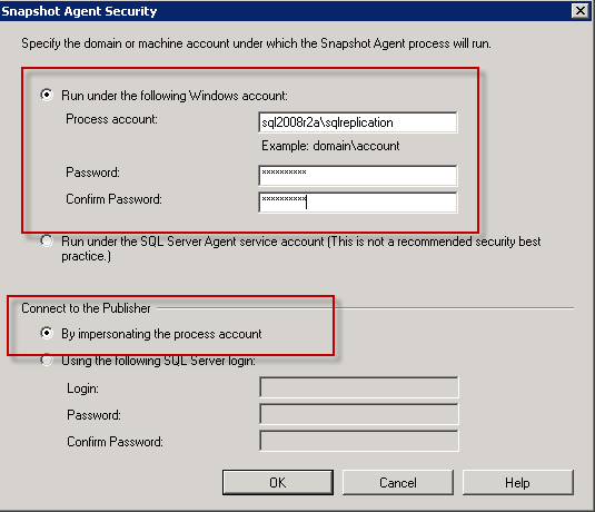 - Connect to distributor with a Windows account (process account). Process account at least db_owner database role in distribution database. Process account has write permission to snapshot share