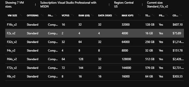 The process is mostly compute intensive. Fsv2, Fs, F Azure VM type are the compute optimized VM. In this case, Fsv2 (2 vcpu, 4 GB RAM, 4 data disks, 4000 max iops, $75.89 / month) and standard HDD disk was selected.